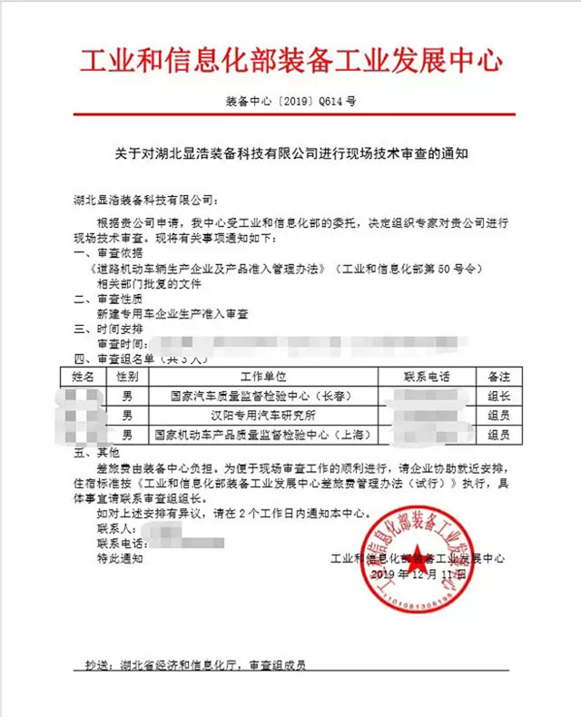 2019年12月19日湖北省顯浩裝備科技有限公司迎來了工信部委派的三位技術(shù)審查專家,三位專家對顯浩申請的專用車企業(yè)準(zhǔn)入進(jìn)行現(xiàn)場技術(shù)審查。依據(jù)《道路機(jī)動車輛生產(chǎn)企業(yè)及產(chǎn)品準(zhǔn)入管理辦法》(工業(yè)和信息化部第50號令)經(jīng)過三天的嚴(yán)格審查。專家對顯浩在送血車、檢測車、監(jiān)測車、冷藏車等專用車的研發(fā)、生產(chǎn)、銷售、售后服務(wù)等能力方面給予高度認(rèn)可,并一次性通過了現(xiàn)場審查。隨后將審查情況及材料匯報國家工信部專家組審查。
