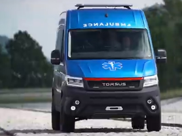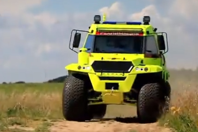 TORSUS PRAETORIAN,捷克共和國制造的大容量高性能車型??梢暂p松的穿越困難地形將病患從人跡罕至的地方運送到醫(yī)療機構(gòu)。大型車長8.4米,總重量是13.4噸。有3個擔(dān)架的放置空間,配備了一個自動舉升的系統(tǒng)。搭載一臺290馬力的發(fā)動機,最大扭矩為1150牛米,最高時速100公里每小時。