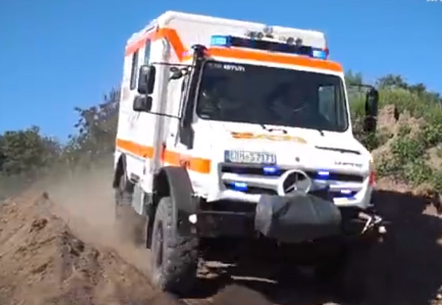 Mercedes Unimog U 4023,德國制造的堅固可靠的車輛??梢詾槠h(yuǎn)地區(qū)的人提供醫(yī)療服務(wù),車輛長6米,總重量為10.3噸。配備了自恢復(fù)絞盤輪胎充氣系統(tǒng)。發(fā)動機功率為231馬力,最高時速是89公里每小時??梢源┰缴稚矫}等困難的地形。也可以穿越水深1.2米的區(qū)域。