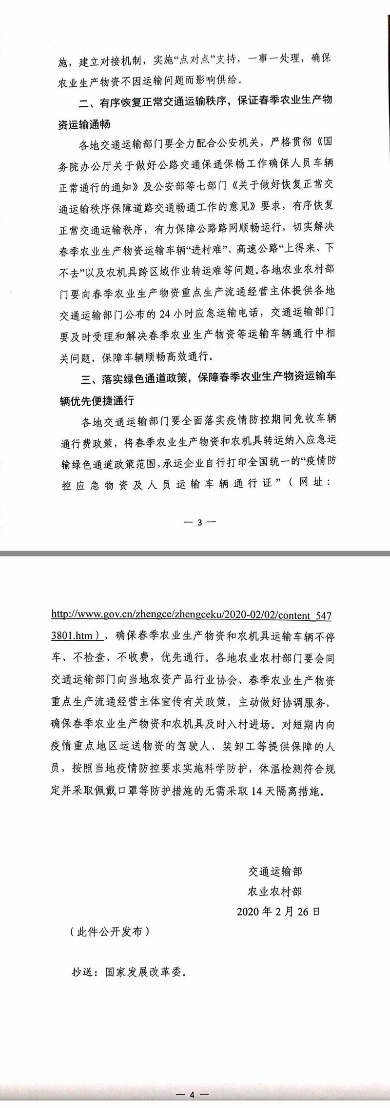 通知還要求,各地交通運輸部門要全面落實疫情防控期間免收車輛通行費政策,將春季農(nóng)業(yè)生產(chǎn)物資和農(nóng)機具轉(zhuǎn)運納入應(yīng)急運輸綠色通道政策范圍,承運企業(yè)自行打印全國統(tǒng)一的“疫情防控應(yīng)急物資及人員運輸車輛通行證”,確保物資和農(nóng)機具運輸車輛不停車、不檢查、不收費,優(yōu)先通行。