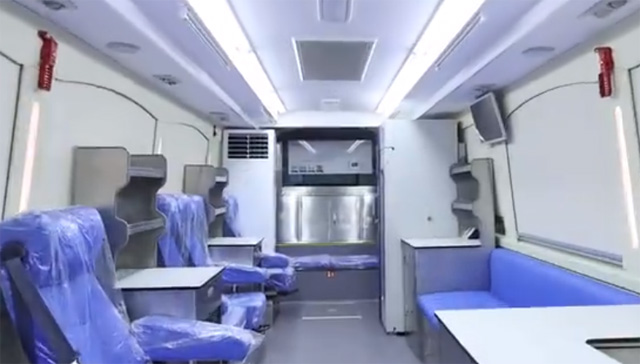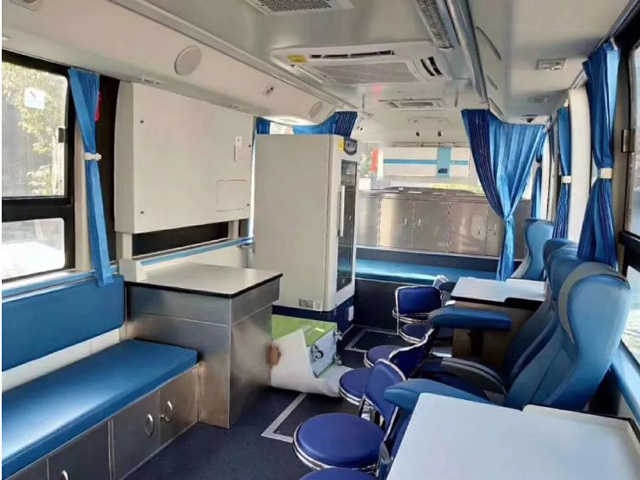 消毒燈跟照明燈車廂尾部是有一個動態(tài)的消毒機,那個是可以在采血的過程中全程消毒的。整個頂棚比原車的空間更大一些。取消了原車的窗簾,改成了動車的窗簾。都進行了包成柱窗眉這塊的裝飾改造。