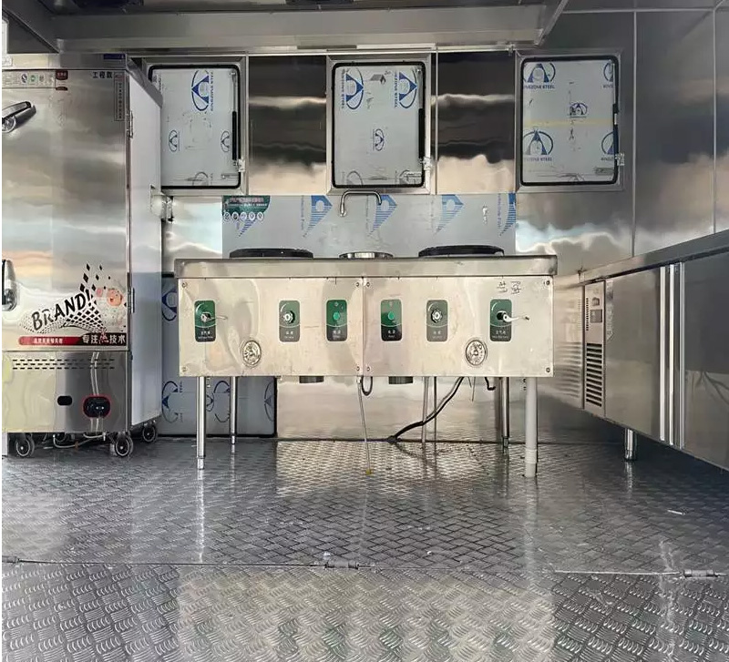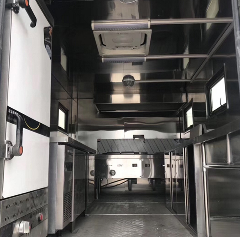 1)餐車的車廂有兩層隔熱,布局合理。外面是鋼板,中間有阻燃材料,內板不銹鋼,簡潔大氣的外觀,全不銹鋼的內飾,干凈衛(wèi)生、吃起來放心。