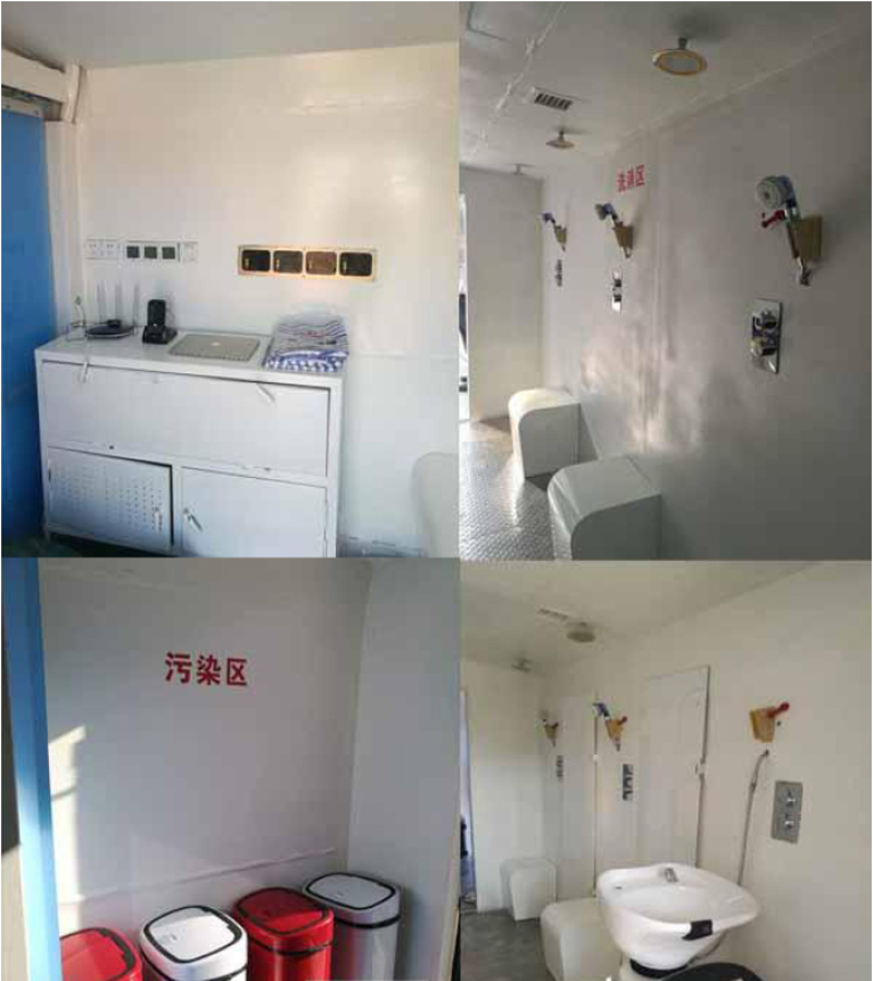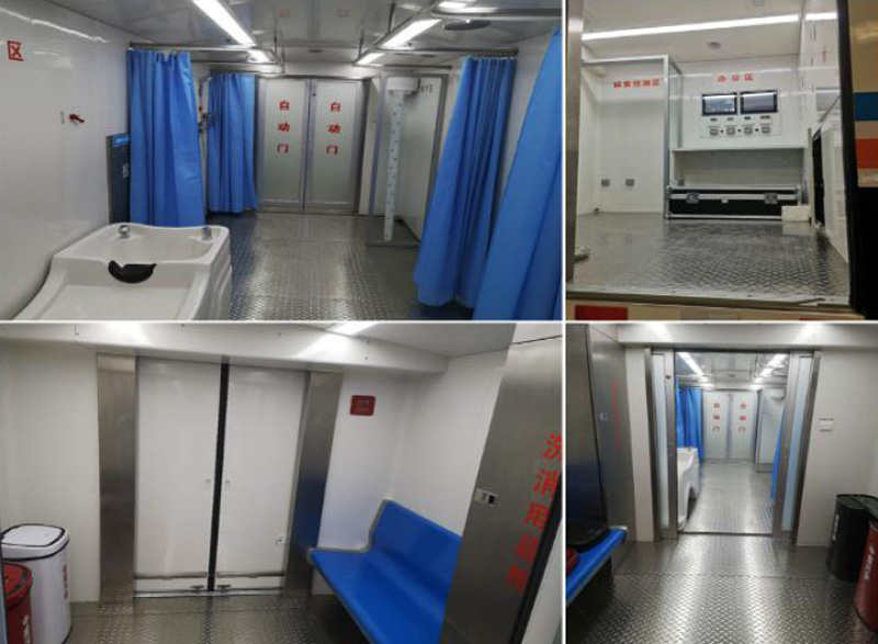 2. 核化污染洗消車空調(diào)系統(tǒng)安裝在車廂與車頭之間;水箱、洗消液箱安裝在車廂外部;車廂防腐密封結(jié)構(gòu),車廂廂體外壁和內(nèi)壁均采用光滑和圓角結(jié)構(gòu),內(nèi)外光潔。車廂內(nèi)包括污染區(qū)、洗消區(qū)、清潔區(qū)、感應(yīng)推拉門、雙開塞拉門、單開塞拉門;污染區(qū)、洗消區(qū)和清潔區(qū)由感應(yīng)推拉門相互隔離;從污染區(qū)進入洗消區(qū)以及從洗消區(qū)進入清潔區(qū)需經(jīng)過紅外感應(yīng)平移非接觸式感應(yīng)推拉門;污染區(qū)的入口安裝雙開塞拉門;潔凈區(qū)的出口安裝單開塞拉門;升降平臺安裝在污染區(qū)入口和清潔區(qū)出口開塞拉門外;污染區(qū)包括洗消用品柜、污染衣物回收箱、排風(fēng)系統(tǒng)、空調(diào)系統(tǒng);洗消區(qū)包括洗眼、洗頭、局部洗消、全身洗消、新風(fēng)系統(tǒng)、排風(fēng)系統(tǒng)、空調(diào)系統(tǒng)、污水排放口和外接污水收集袋;清潔區(qū)包括中控平臺、核輻射檢測儀、更衣柜、烘干室、電器柜、新風(fēng)系統(tǒng)、空調(diào)系統(tǒng);核輻射檢測儀為門柱式輻射儀,安裝在清潔區(qū)感應(yīng)推拉門旁側(cè);人員每通過感應(yīng)推拉門前由核輻射檢測儀進行輻射水平檢測及核素檢測。