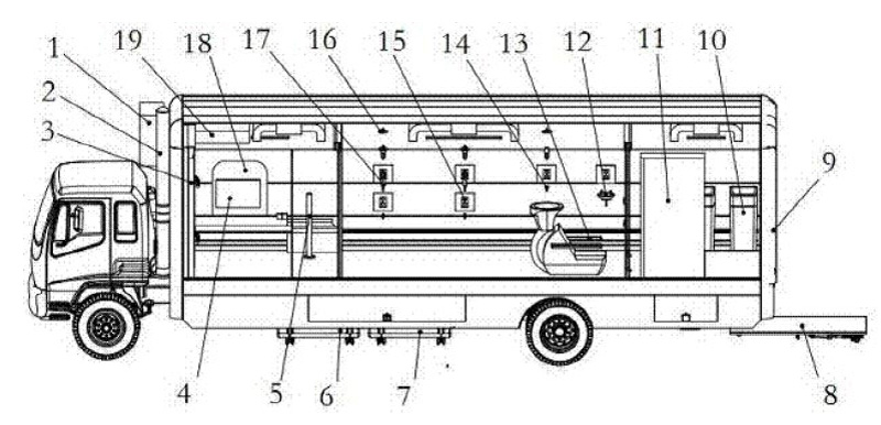 1. 核化污染洗消車;包括供電系統(tǒng)、照明系統(tǒng)、空調(diào)系統(tǒng)、供水及溫控系統(tǒng)、洗消液供給及溫控系統(tǒng)。其特征在于:還包括車廂、水箱、洗消液箱、升降平臺、水管路入口、電器控制線入口;所述裝置結(jié)構(gòu)皆集成安裝在一部車上。