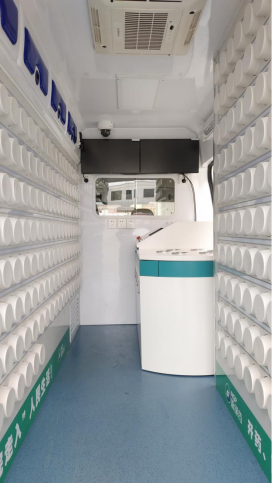 移動(dòng)中藥房車車廂頂部安裝LED滾動(dòng)屏,顯示接口與發(fā)藥設(shè)備對(duì)接,顯示所發(fā)藥品名稱。頂部還安裝紫外燈以便對(duì)整個(gè)車廂進(jìn)行殺菌。車輛有GPS,車內(nèi)提供5G(含4G)網(wǎng)絡(luò)連接。配置了駐車空調(diào)和行車空調(diào),以便停車熄火時(shí)為車廂內(nèi)提供溫濕度調(diào)節(jié)。